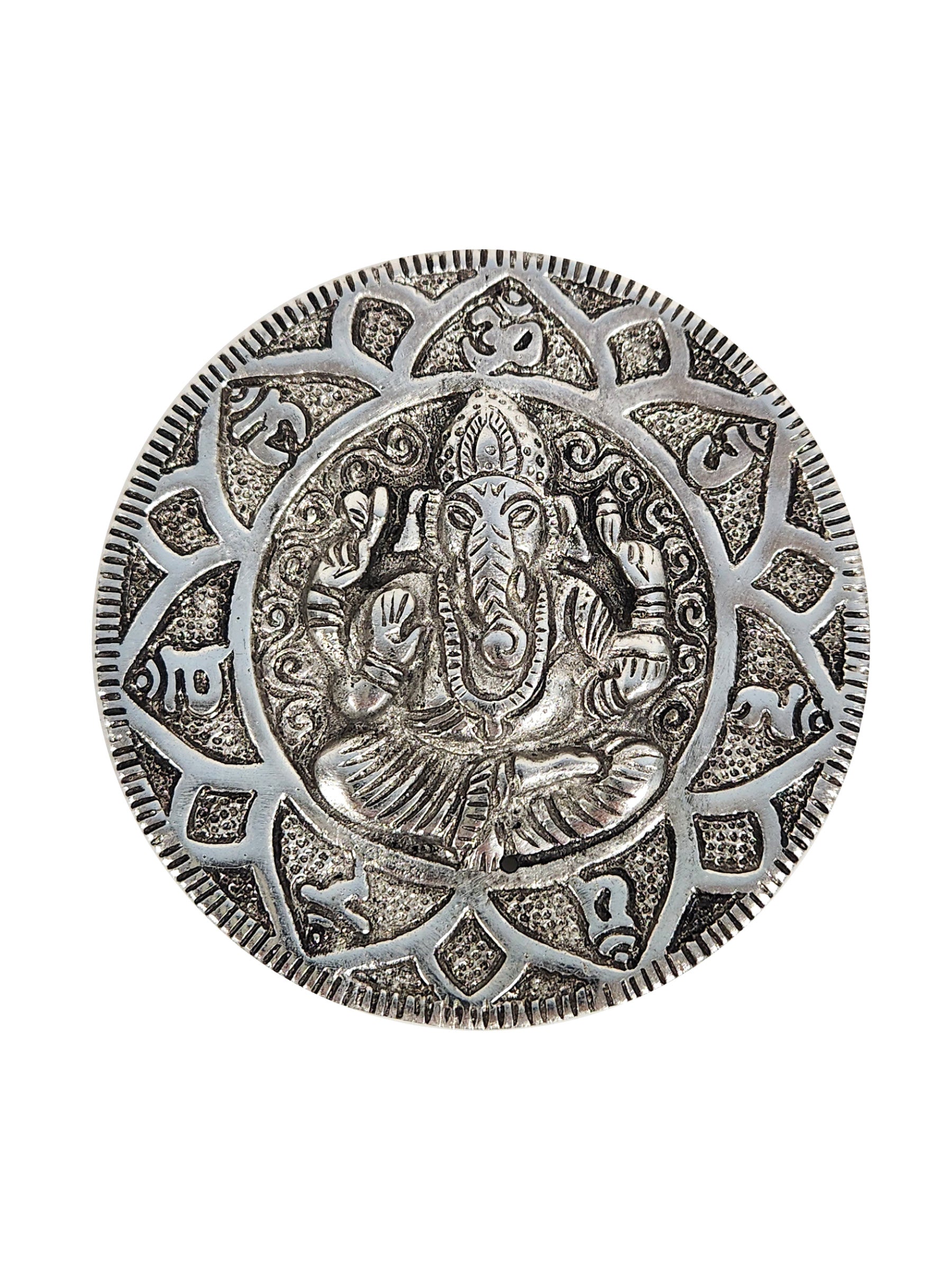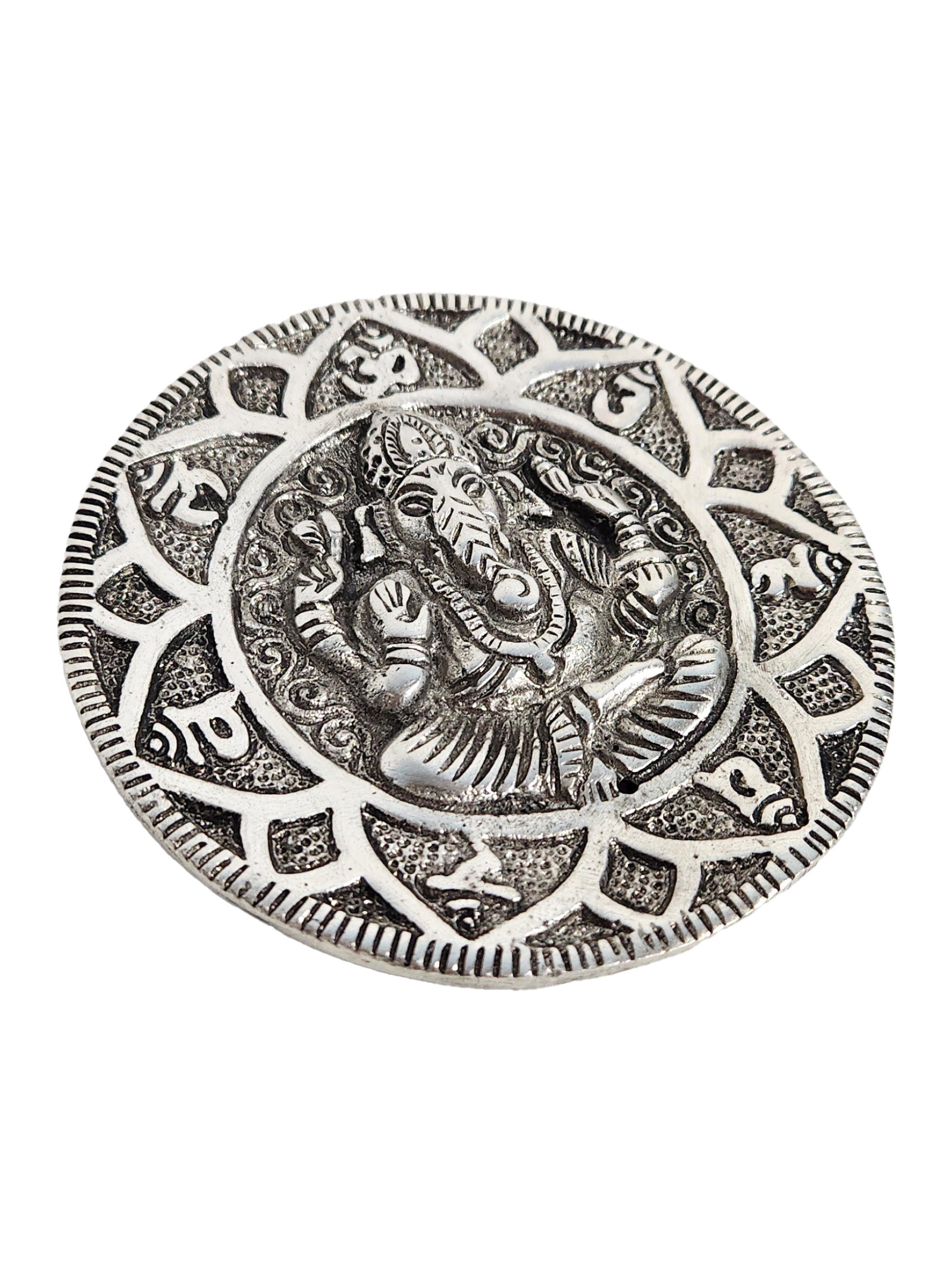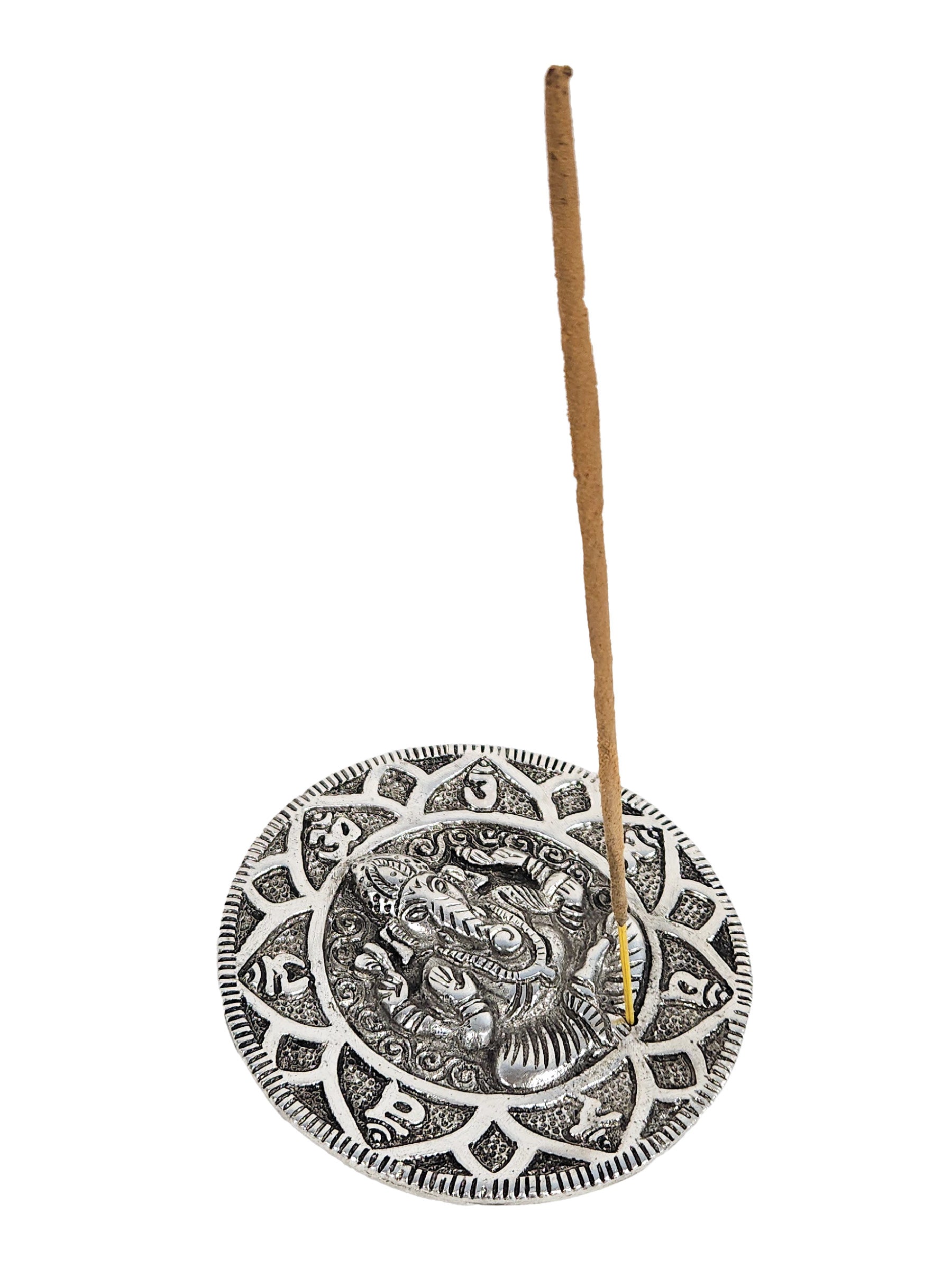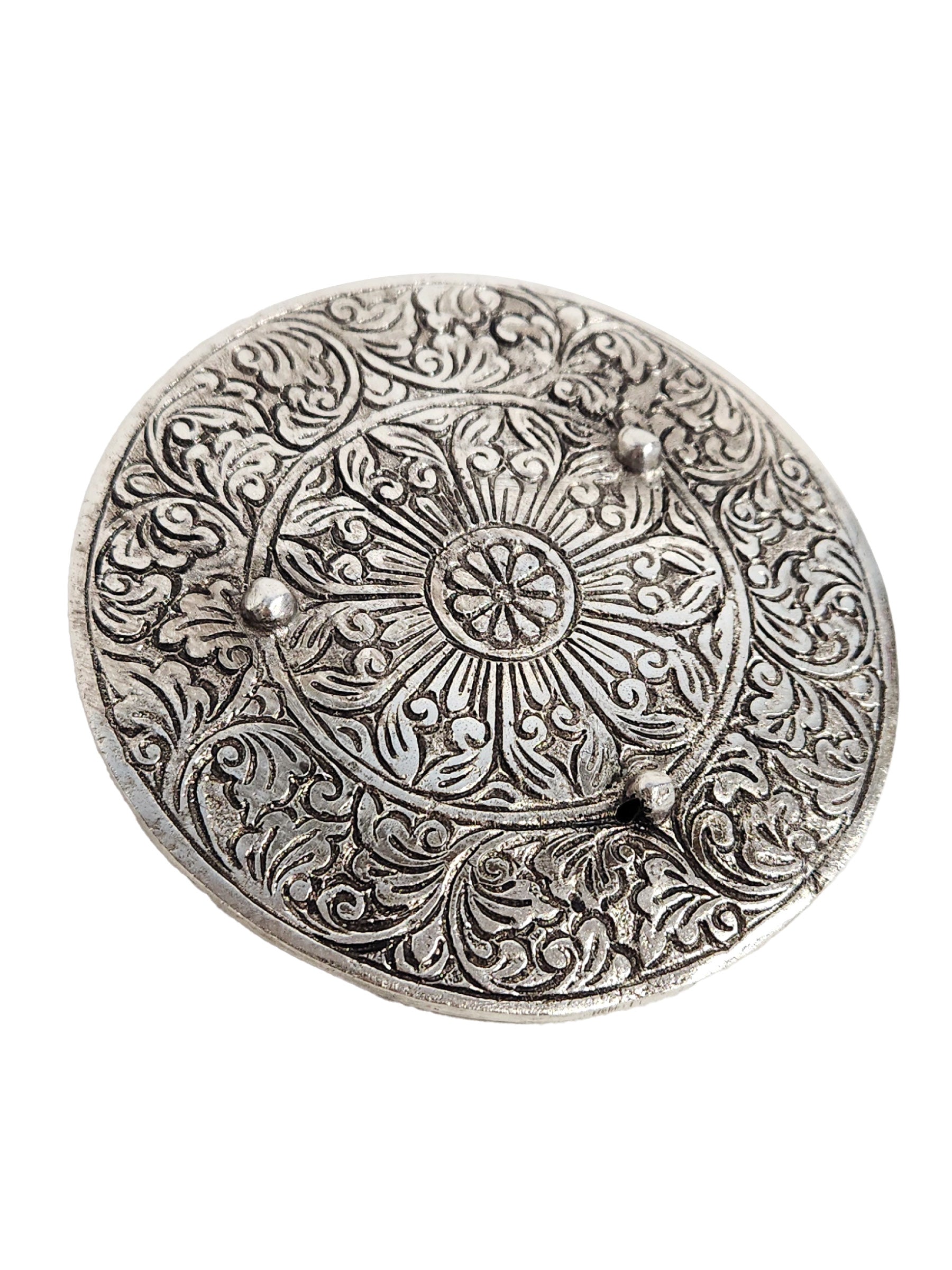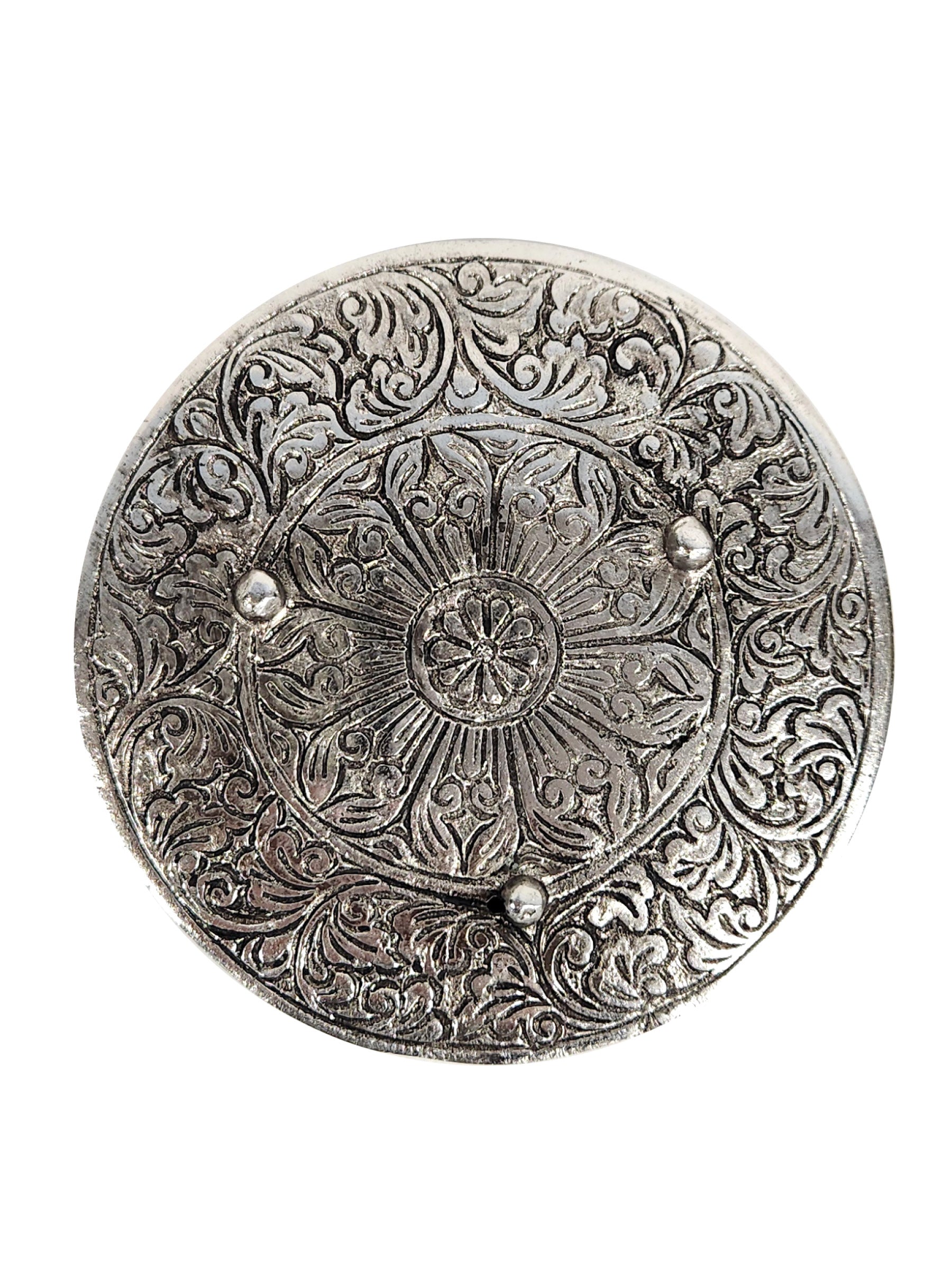 This round incense holder was designed to hold your favorite stick or cone incense, crafted from aluminum. It is the perfect size for use on various surfaces such as tabletops, shelves, or altar spaces, adding a Zen atmosphere to any room.