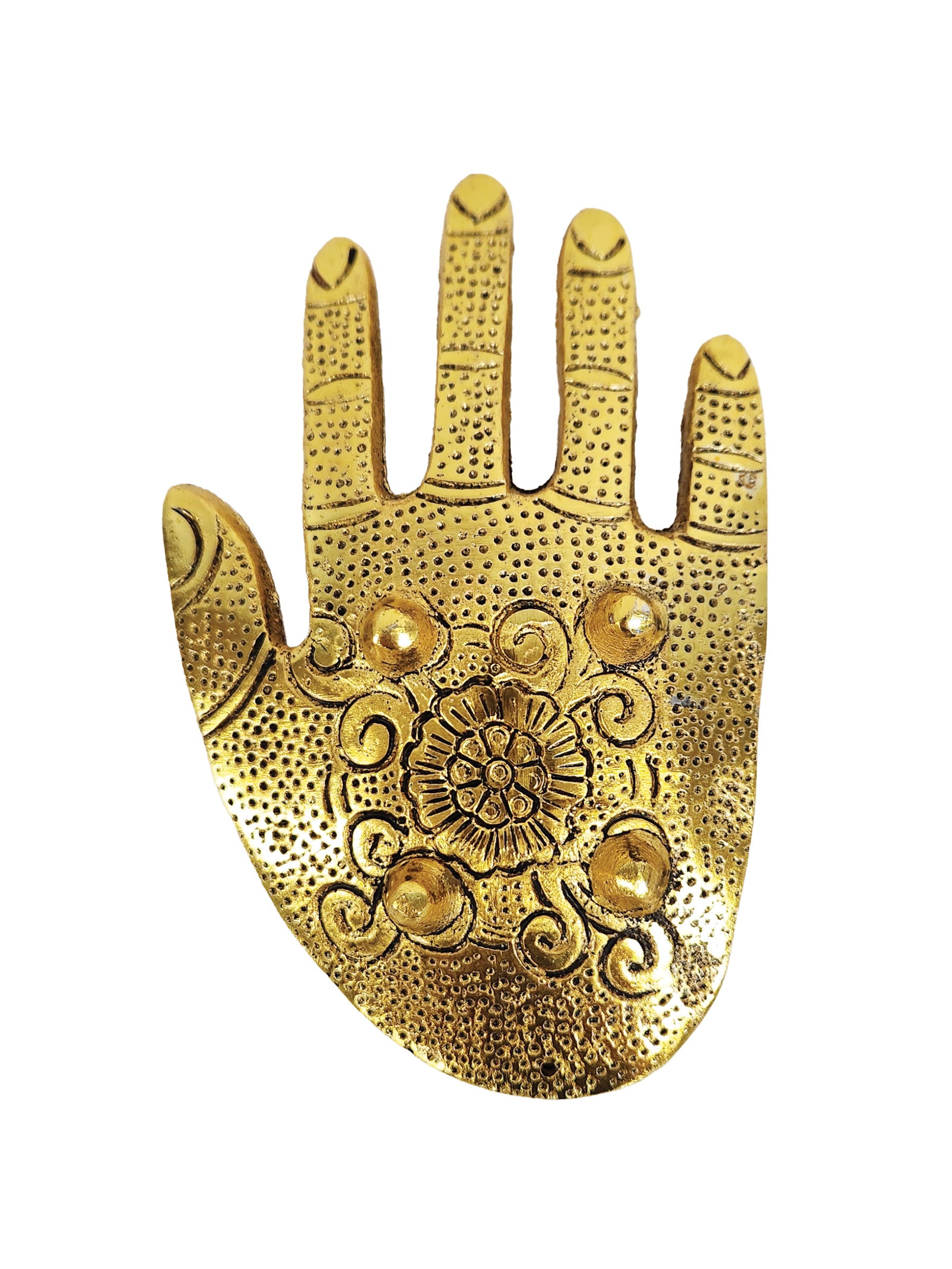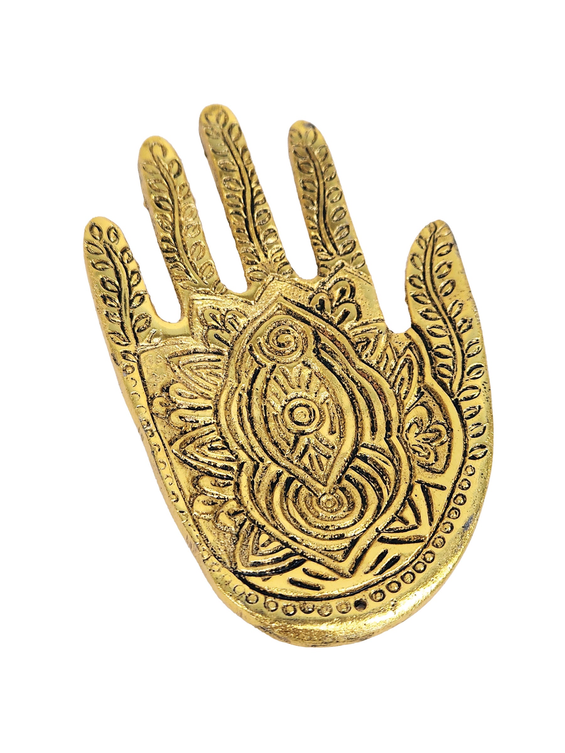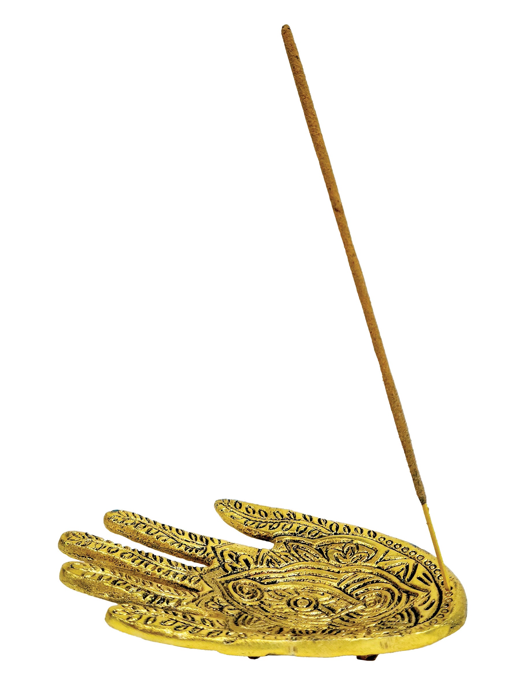 This Hamsa golden color Hand Evil Eye incense holder was designed to hold your favorite stick or cone incense, crafted from aluminum. It is the perfect size for use on various surfaces such as tabletops, shelves, or altar spaces, adding a Zen atmosphere to any room.