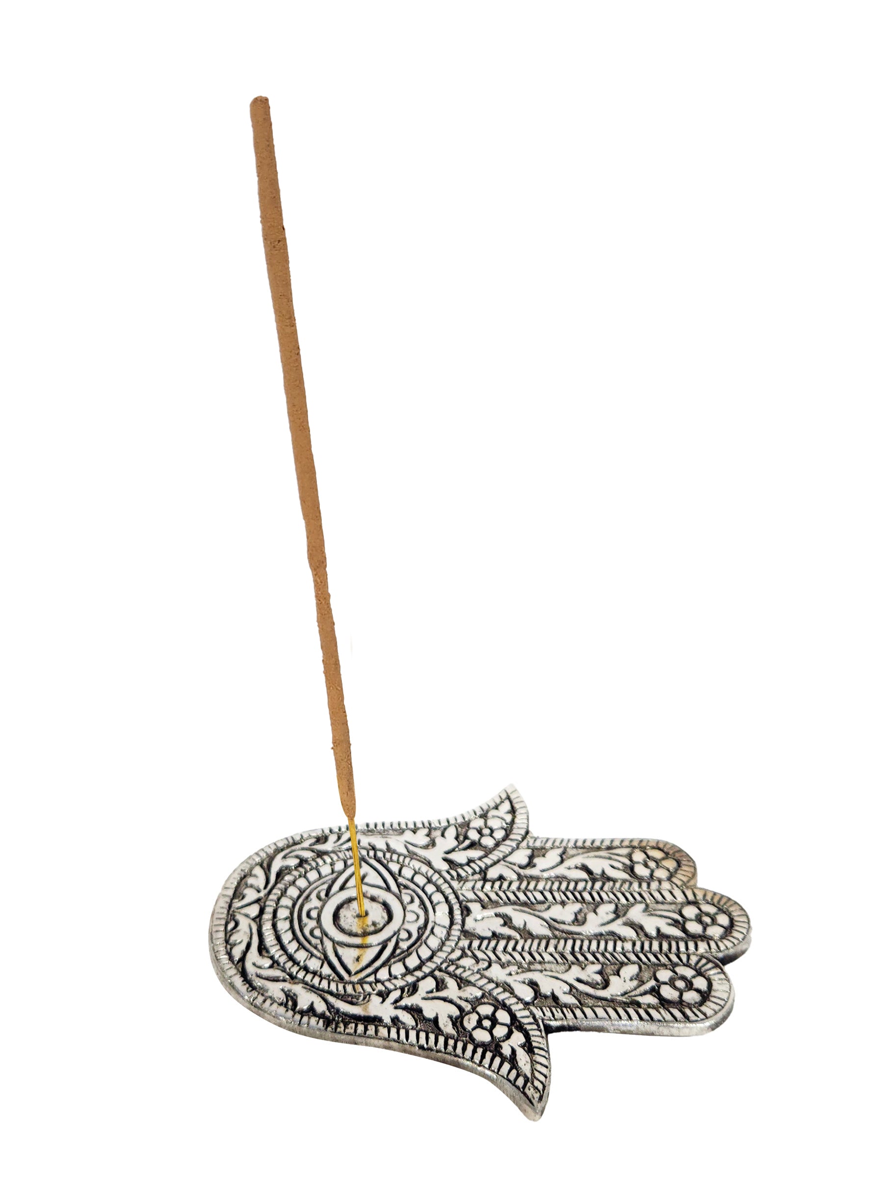 This Hamsa Hand incense holder was designed to hold your favorite stick or cone incense, crafted from aluminum. It is the perfect size for use on various surfaces such as tabletops, shelves, or altar spaces, adding a Zen atmosphere to any room.