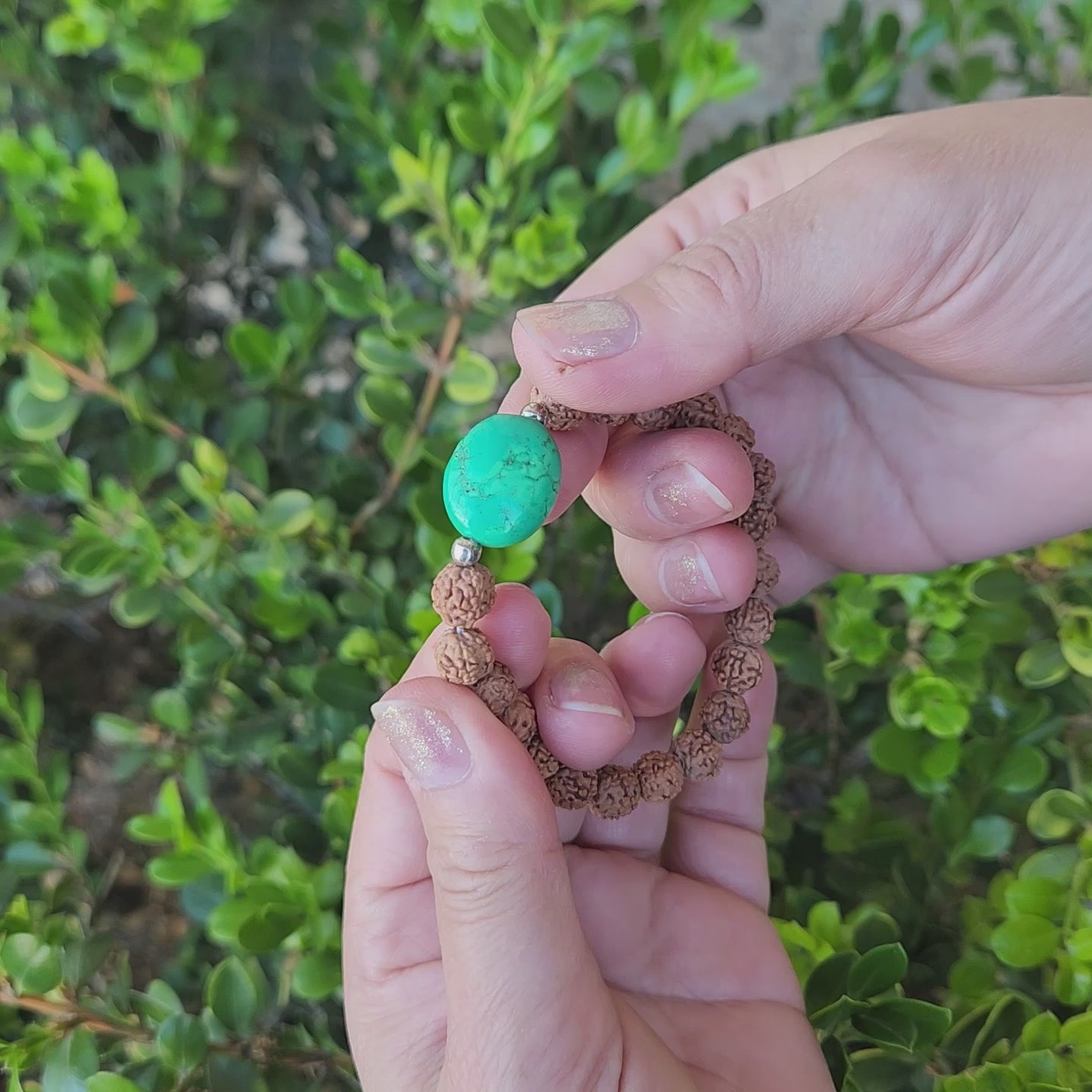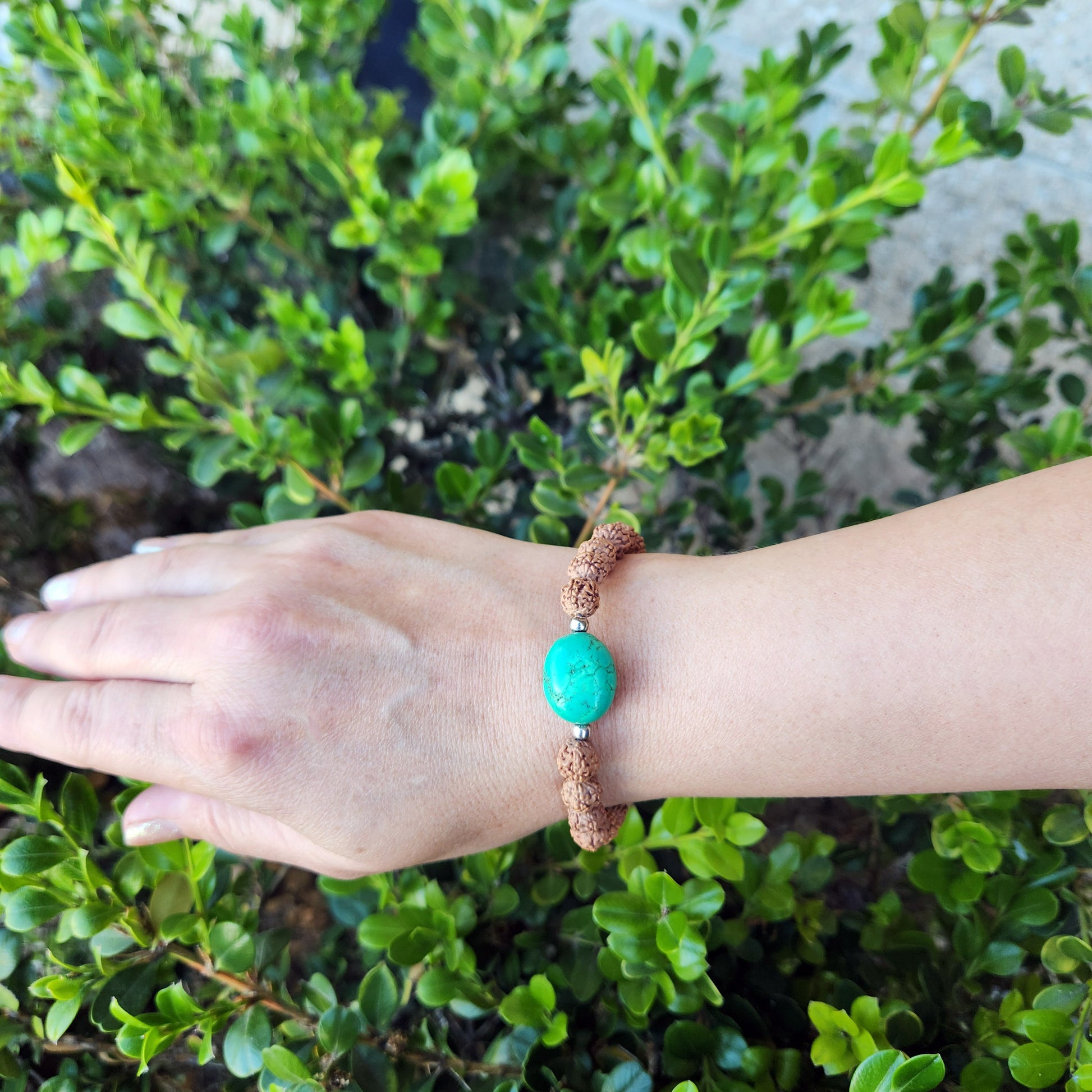 Designed for comfort, this bracelet is one size fits all, making it a versatile accessory for any wrist. The combination of rudraksha and turquoise is believed to promote tranquility, protection, and balance, making it perfect for daily wear or meditation.