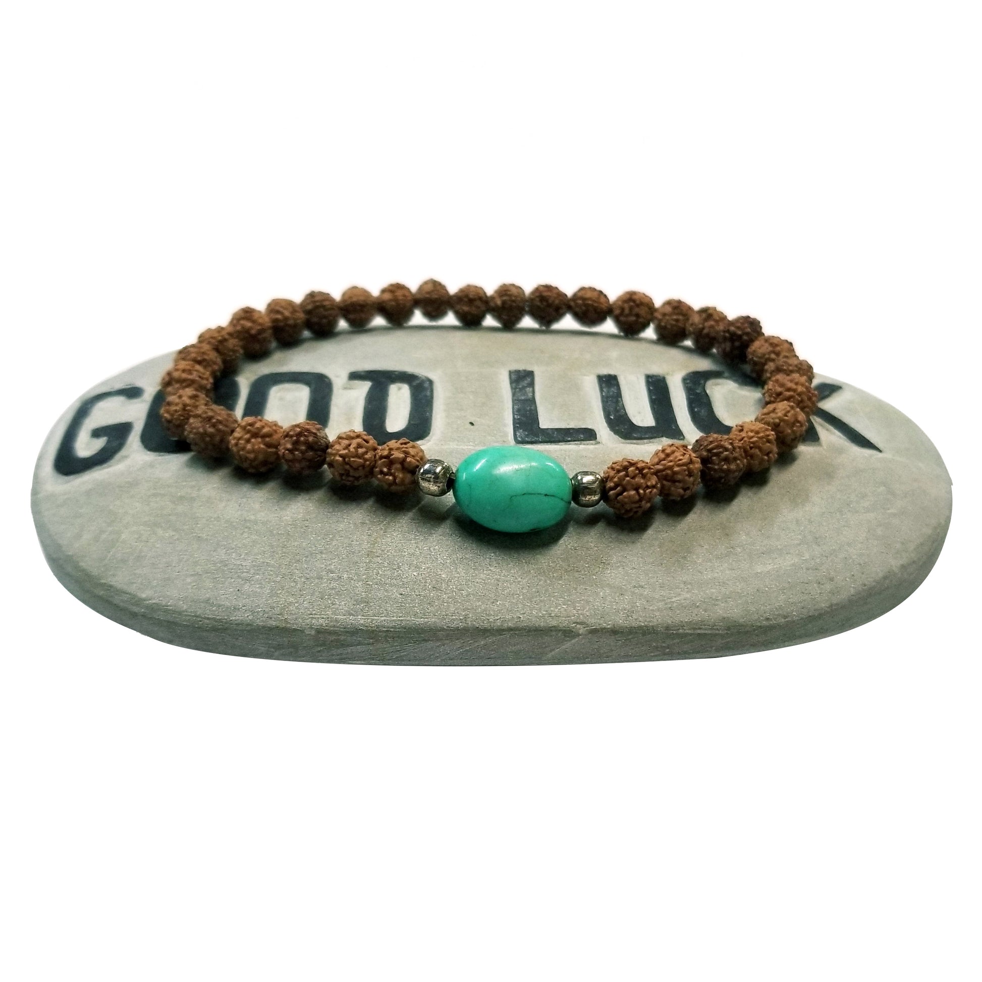 This stretchy beaded bracelet features small rudraksha beads, known for their spiritual significance, with a striking turquoise bead at the center that adds a pop of color.