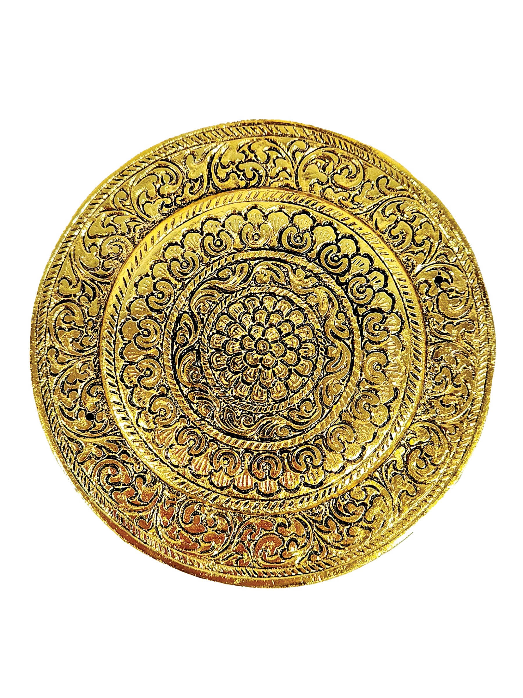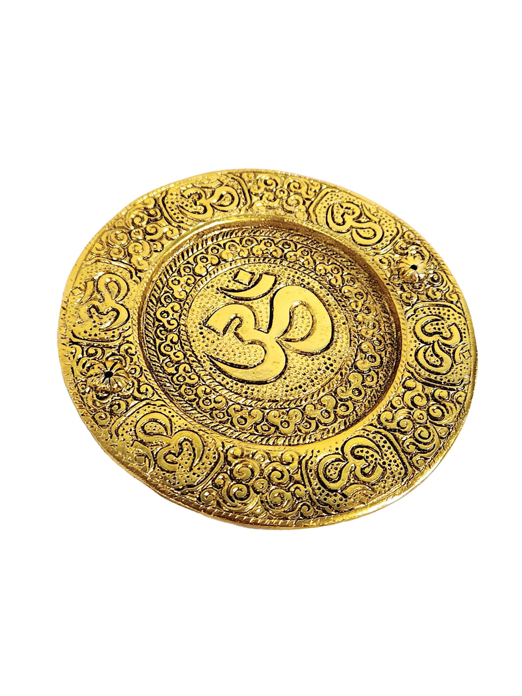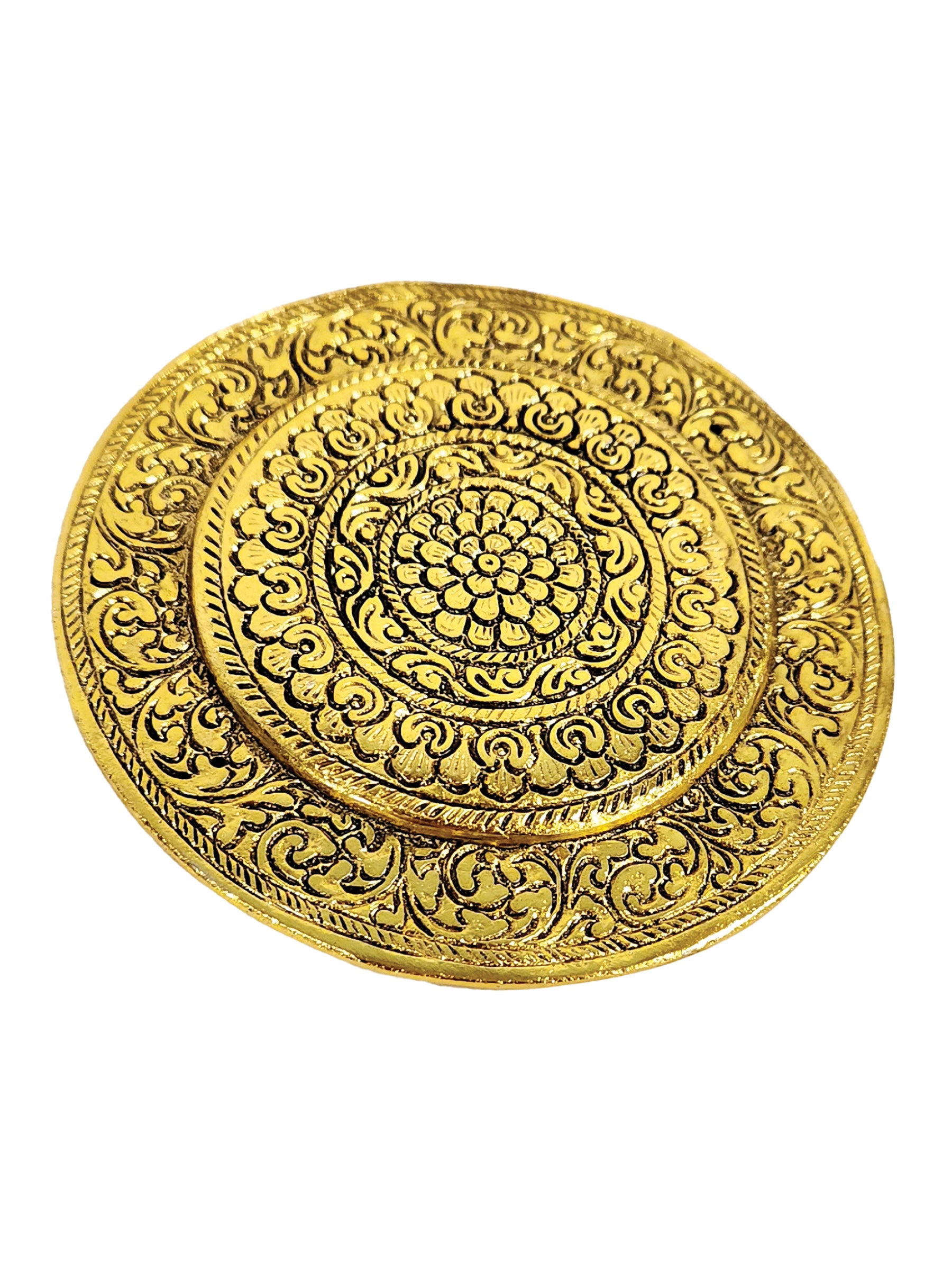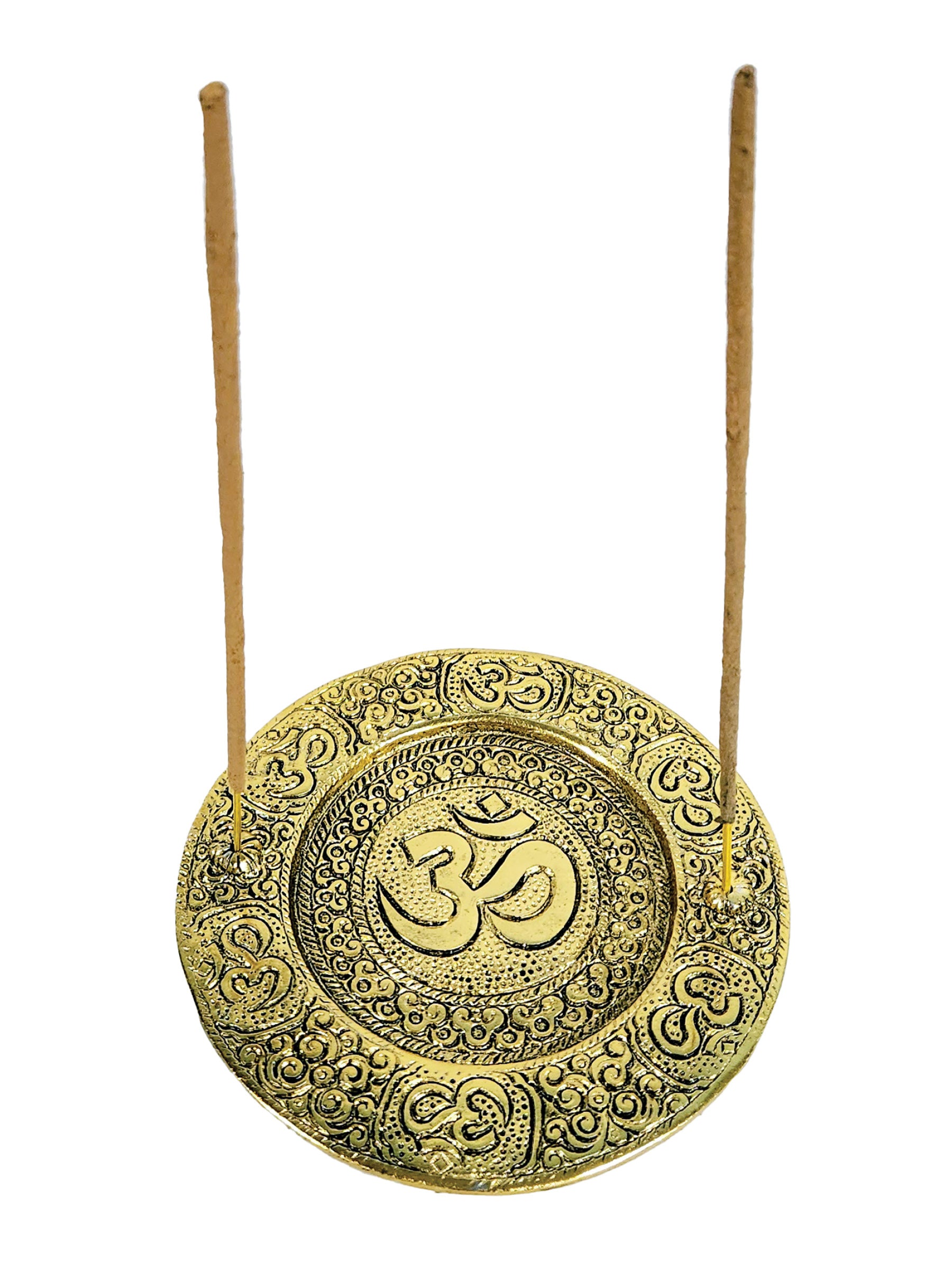 This round golden color incense holder was designed to hold your favorite stick or cone incense, crafted from aluminum. It is the perfect size for use on various surfaces such as tabletops, shelves, or altar spaces, adding a Zen atmosphere to any room.