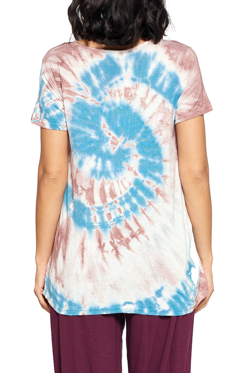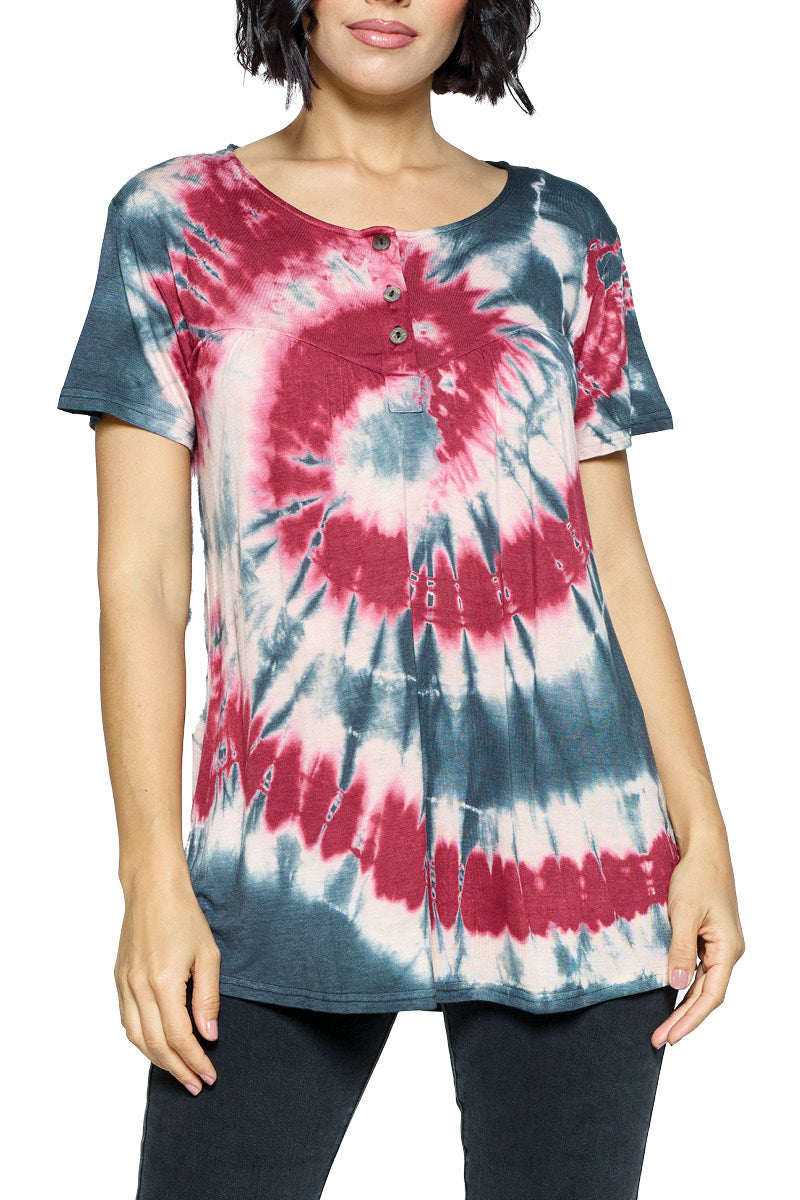 This tie-dye top blends beautiful colors in an fun spiral design. You'll love the button up neckline, short sleeves, and the incredibly weightless, stretchy material! this relaxed top is as comfortable and stylish as it looks.