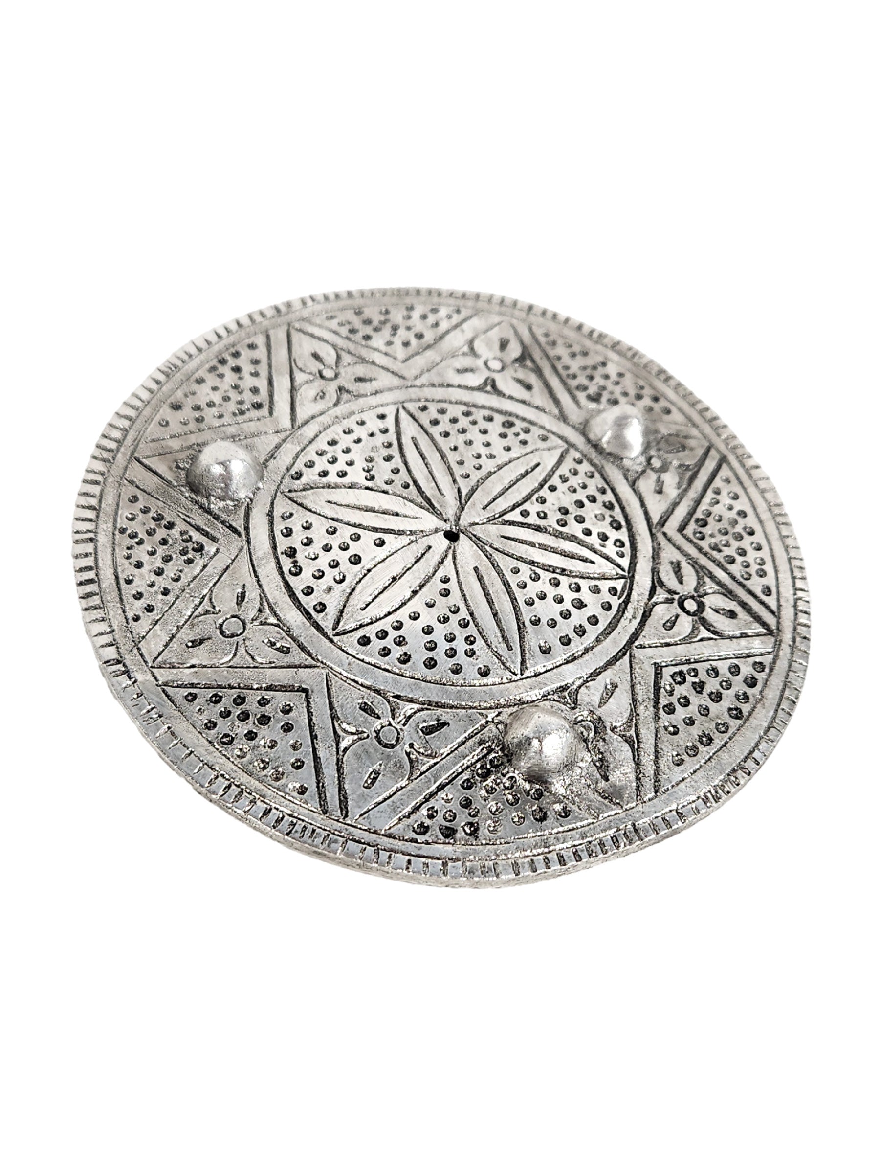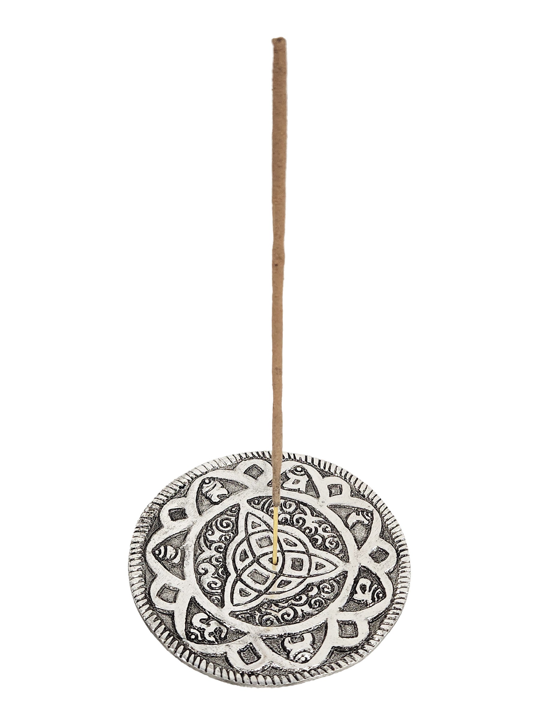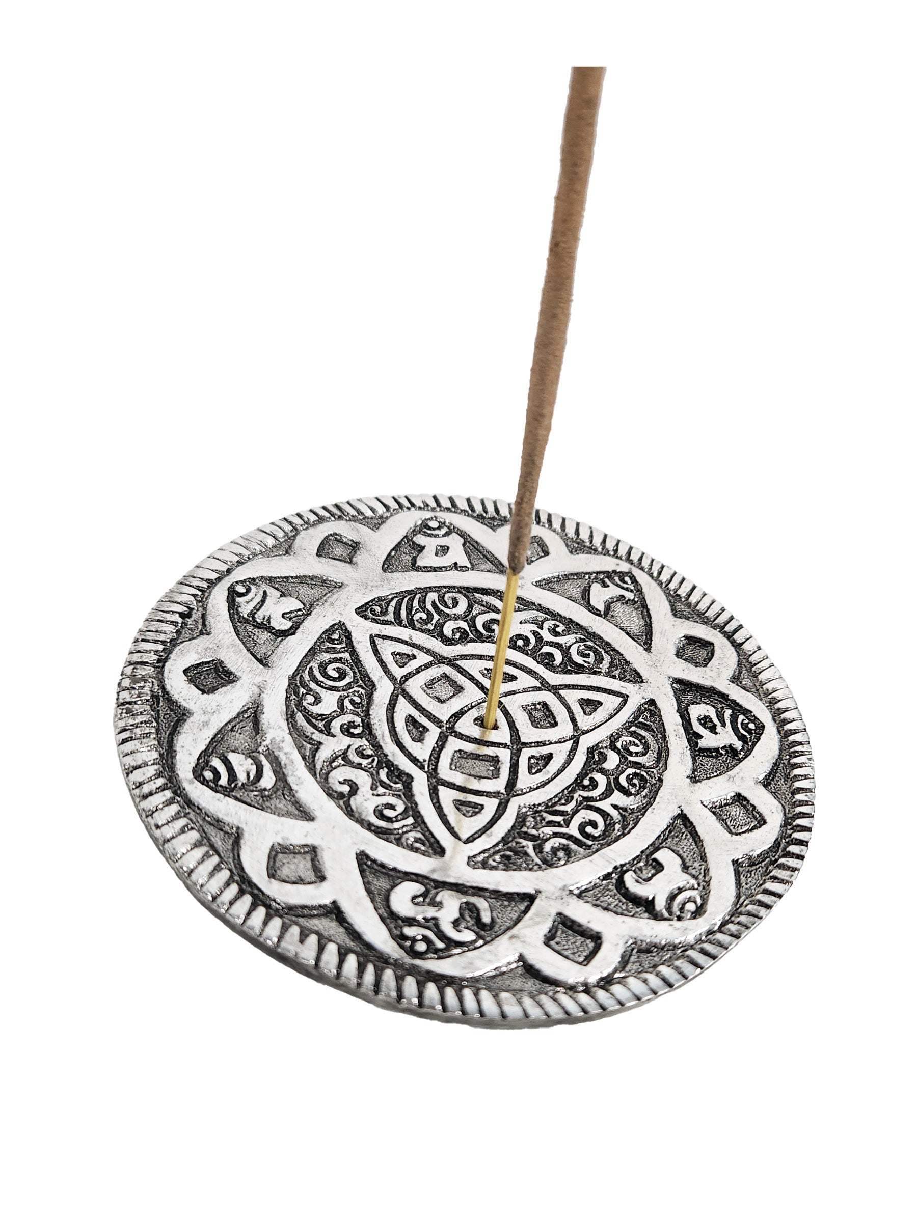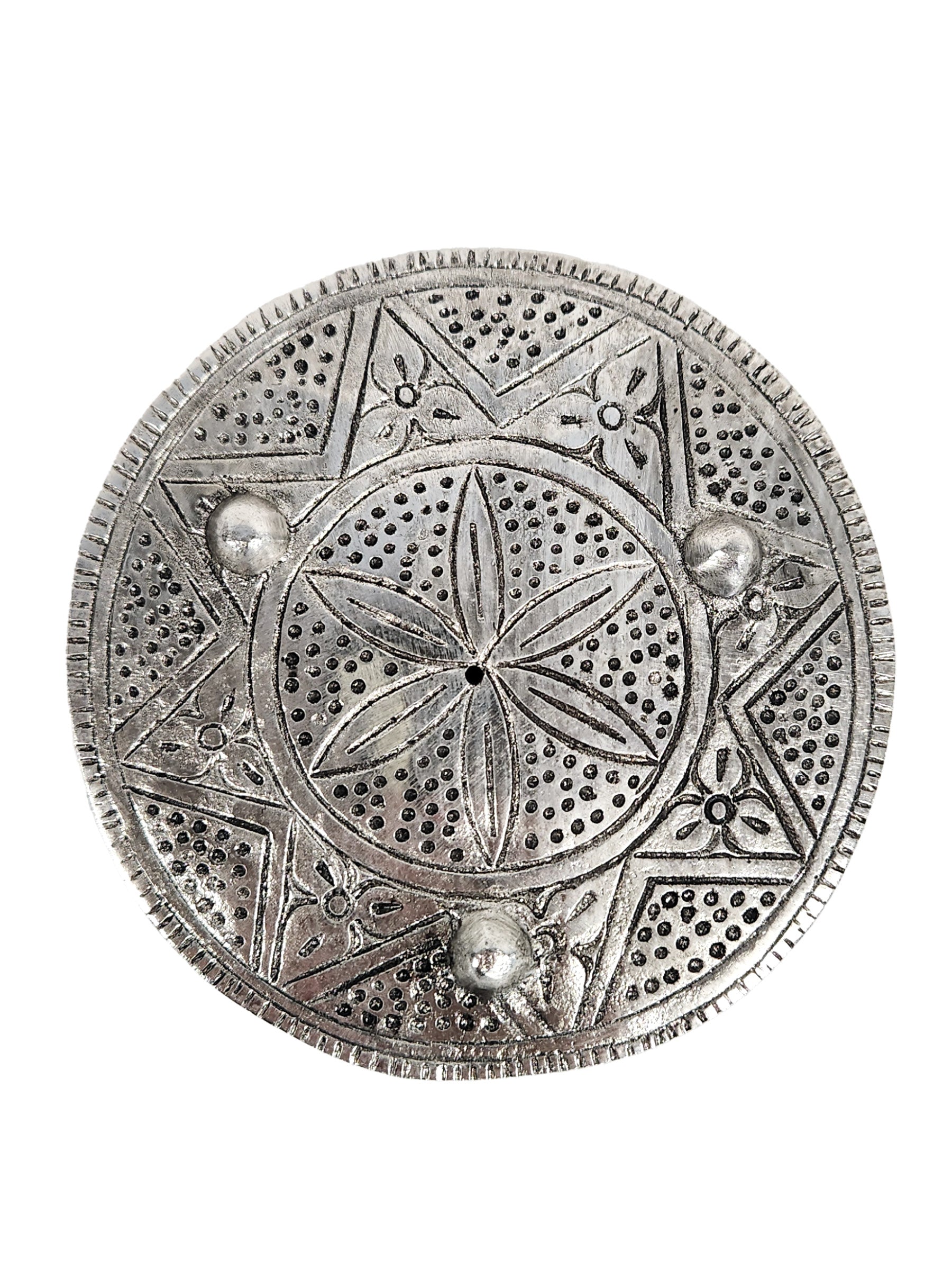 This round incense holder was designed to hold your favorite stick or cone incense, crafted from aluminum. It is the perfect size for use on various surfaces such as tabletops, shelves, or altar spaces, adding a Zen atmosphere to any room.